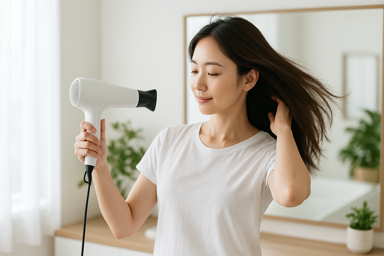 濡れた時間が長いほどダメージは進行。まずタオルで“押し吸い”。こすらず、マイクロファイバーで包みます。乾かす順は「根元→中間→毛先」。ノズルは常に下向きで、10〜15cm離し、風を小刻みに動かすとキューティクルが整列。仕上げに冷風で形状を固定します。